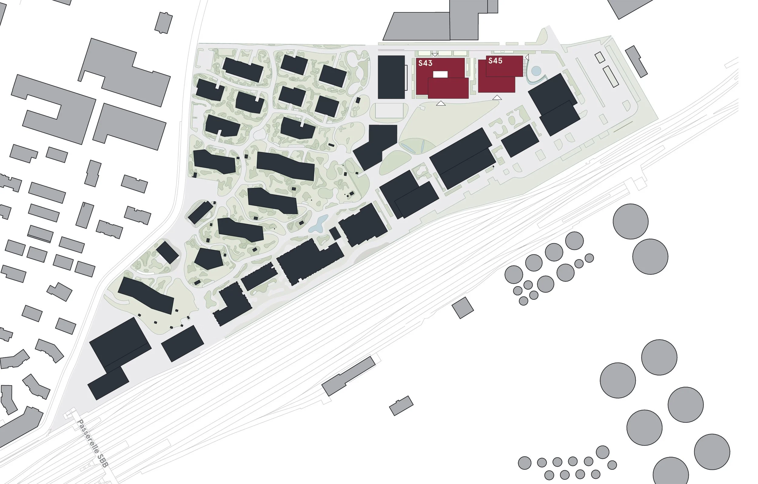 Die Gebäude S43 und S45 bilden die letzten Bausteine im Suurstoffi Areal und schliessen die Überbauung im Areal Ost im Sinne der Gesamtidee des Areals ab. Die zwei unterschiedlich grossen Bauten, bestehend aus jeweils zwei in sich verschränkten Volumen mit je 5 und 7 Geschosse, werden an städtebaulich wichtigen Stellen präzise gesetzt. Während der höhere Gebäudeteil des S43 zum zentralen Element am Park wird, bietet der höhere Gebäudeteil des S45 einen adäquaten Auftakt ins Areal an der Nordostzufahrt. In der Anordnung der beiden Volumina werden sowohl die Gliederung (Höhenstaffelung) wie die Massstäblichkeit des Kontextes weitergeführt bzw. ergänzt.