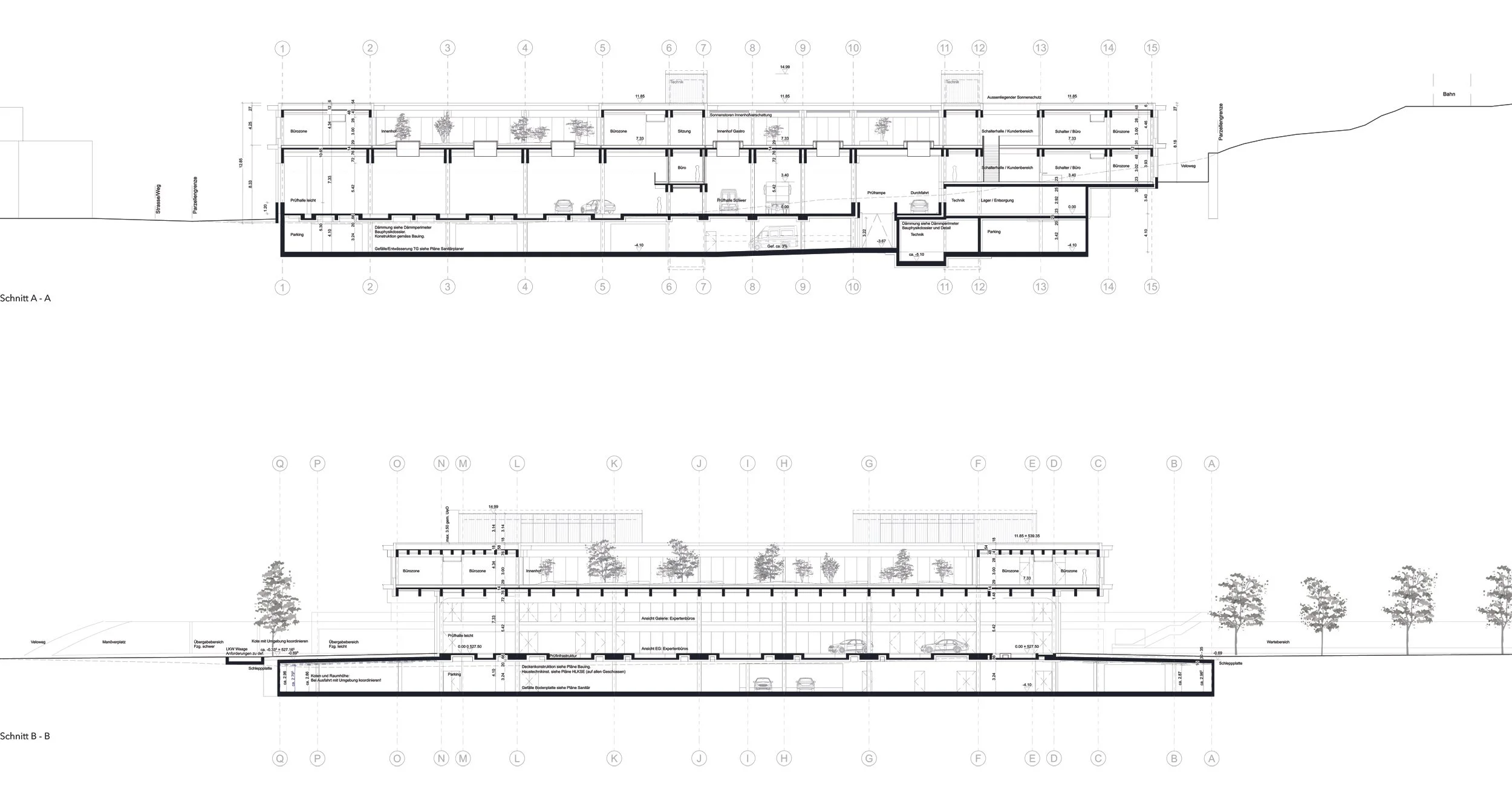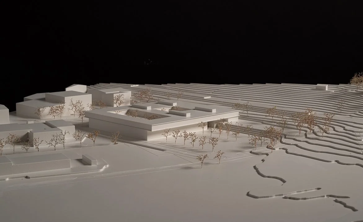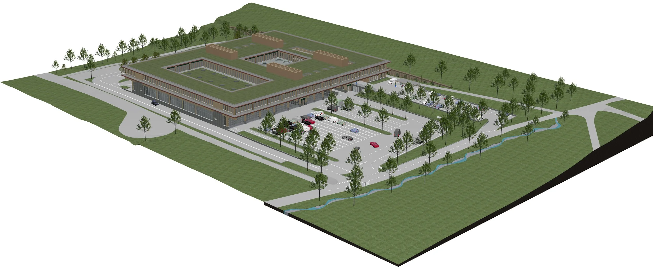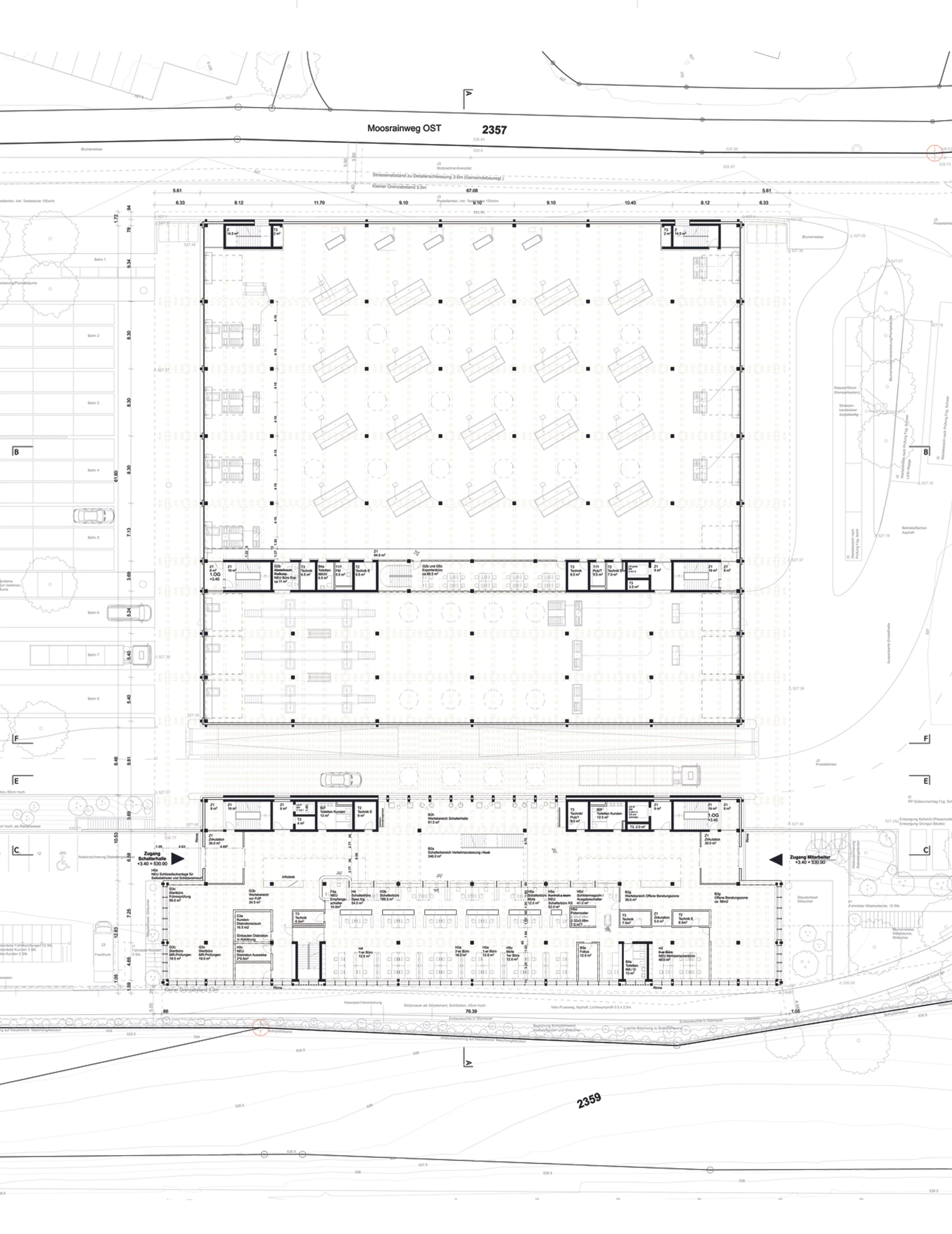 Der Neubau wird mit dem Hang organisiert und parallel dazu ausgerichtet. In der Ebene werden die überhohen Prüfhallen mit den dazugehörigen Aussenfunktionen angeordnet. Die Schalterhalle mit Haupteingang hingegen wird südlich im Hang platziert, eingebettet in einen grosszügigen Grüngürtel, der das Grundstück 3-seitig einfasst. Durch die parallele Setzung zum Hang findet das Projekt einen möglichst behutsamen Umgang mit dem Terrain.