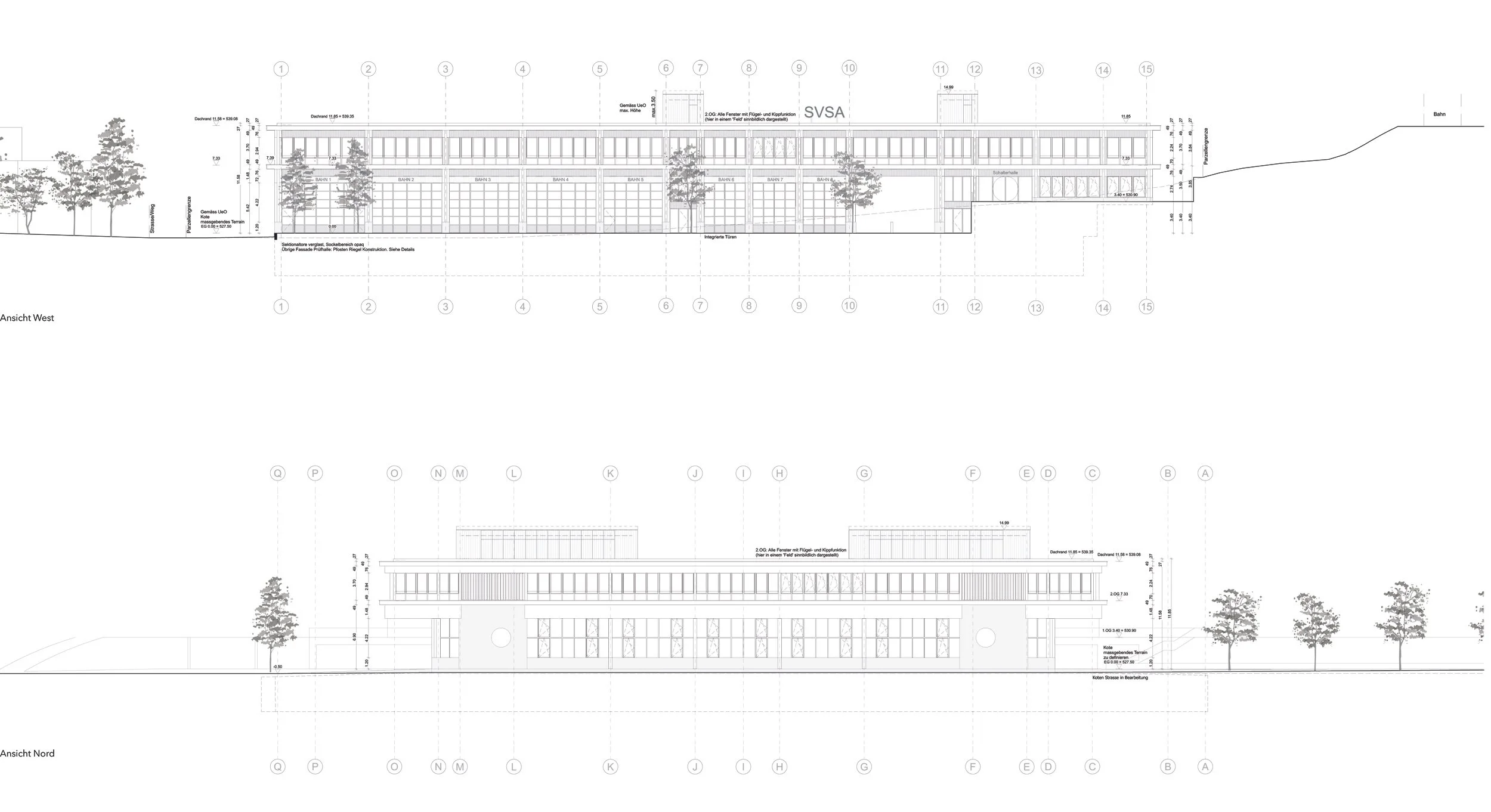 Mit dem Projekt wird ein gemeinsames Haus für alle Nutzungen unter einem Dach geplant. Durch die Stapelung des Raumprogramms entsteht ein 3- bzw. bei den überhohen Prüfhallen ein 2-geschossiger Neubau, dessen Hauptfassade sich nach Westen ausrichtet. Das neue SVSA ist daher von weitem sichtbar und prägt die Dorfeinfahrt nach Münchenbuchsee als Landmark.