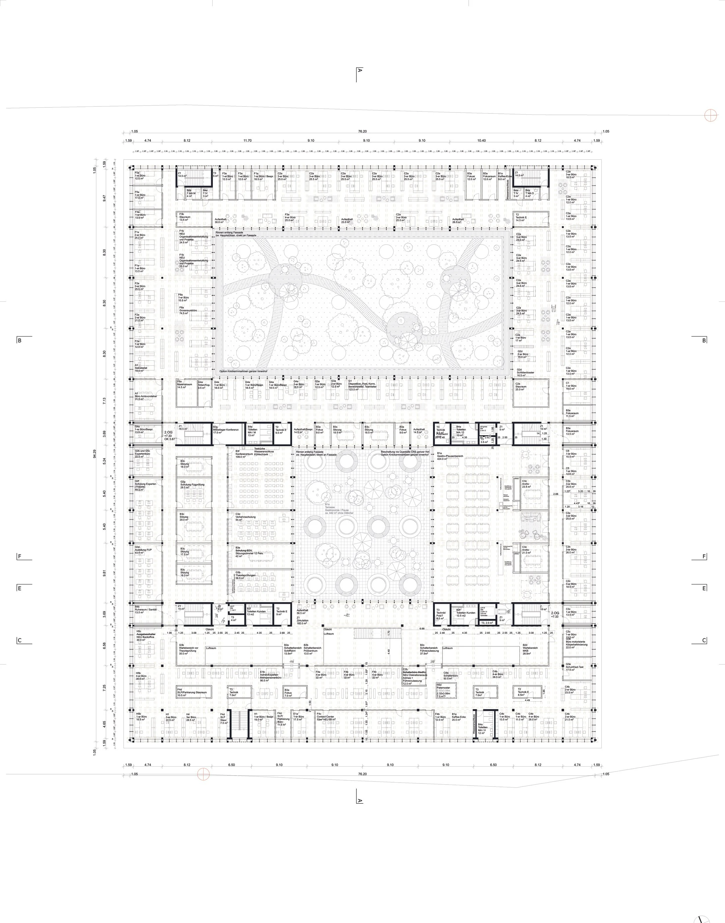 Der Name vom Projekt «Einer für Alle» erläutert im Grundprinzip bereits den Erschliessungsgedanken des Gebäudes. Die offene und übersichtliche Erschliessung im 2. OG verbindet sämtliche Nutzungen über die vertikalen Kerne und lässt so einen maximalen Spielraum für die Verteilung der Büro’s und Abteilungen zu. Alle Funktionen auf den verschiedenen Geschossen sind über die vertikalen Kerne über kurze Distanzen gut erschlossen.